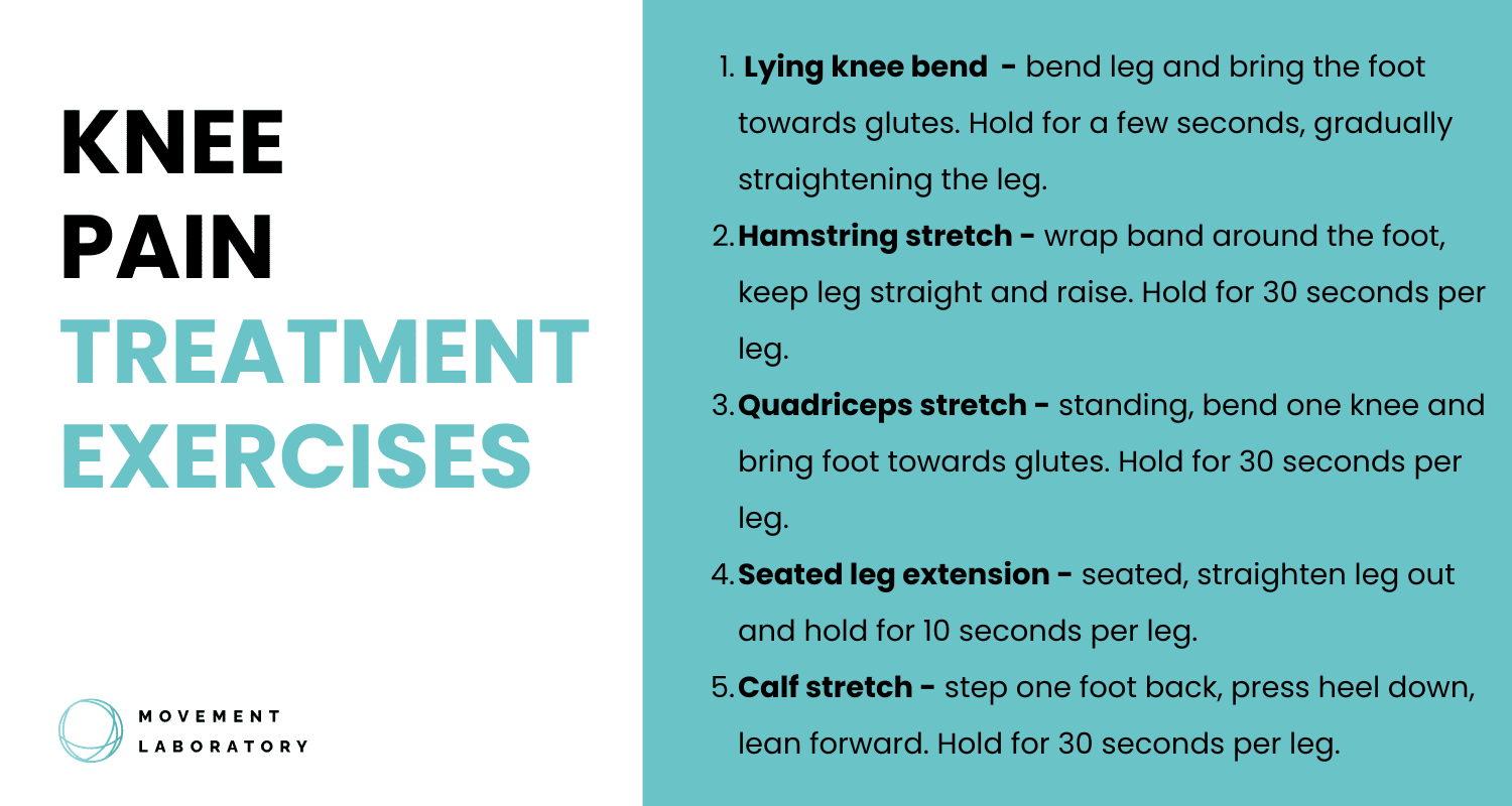 Once the cause of your knee pain has been determined, a physiotherapist will create your personal treatment plan including specific exercises and a certain number of reps needed to treat your condition. Some of the exercises could include: